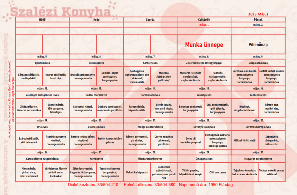 Figyelem! A május 8–9-i (csütörtök és péntek) ebédek a gyerekek számára megrendelésre kerültek, helyben elfogyaszthatók vagy elvihetők. Amennyiben ezekre a napokra nem kérik az étkezést, kérjük, szíveskedjenek lemondani.