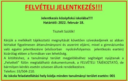 JELENTKEZÉS A KÖZÉPISKOLÁBA! Az egyéni jelentkezés menete a 2021/2022. tanévben zajló középfokú felvételi eljárás során az alábbi linken elérhető! (jelentkezési lap )